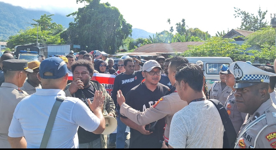 Jayapura – Aparat kepolisian membubarkan aksi demonstrasi tanpa izin yang digelar di pintu masuk Bandara Sentani, Jayapura, Selasa (12/8) pagi. Aksi yang dipimpin aktivis Papua, Panji Mangkunegoro, itu dinilai mengganggu aktivitas bandara dan melanggar aturan ketertiban umum.
